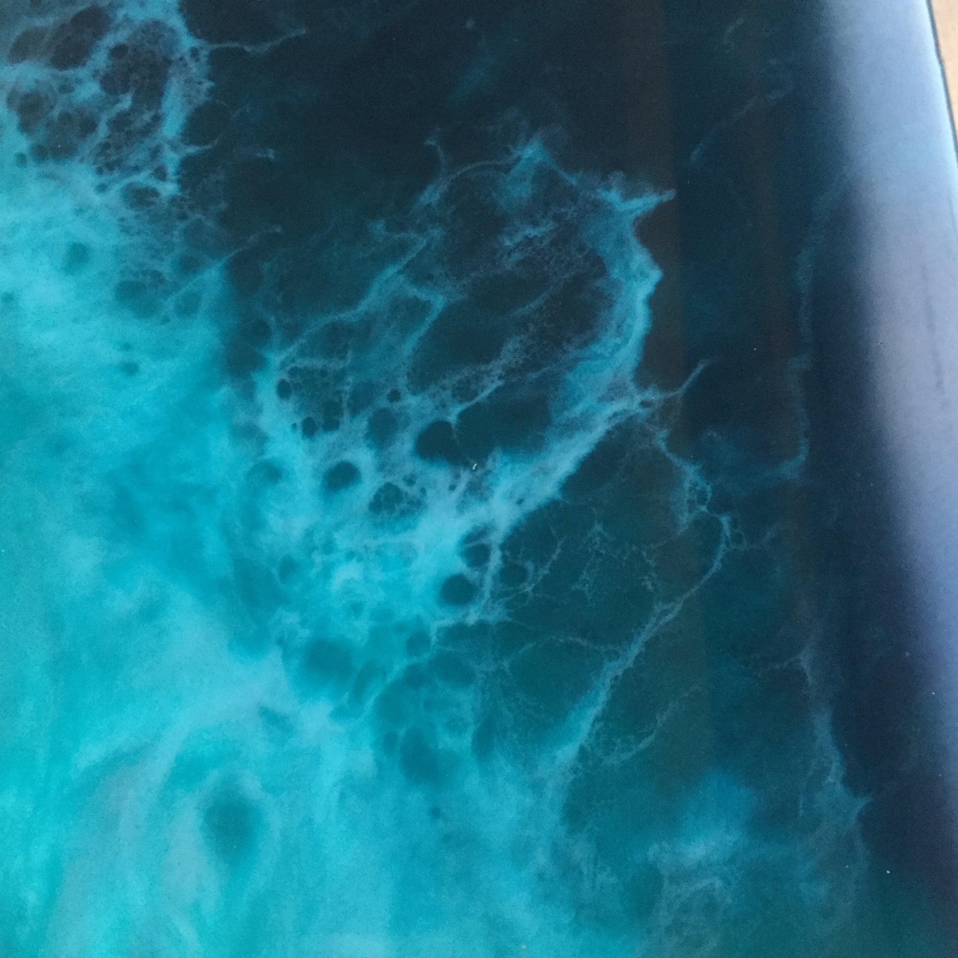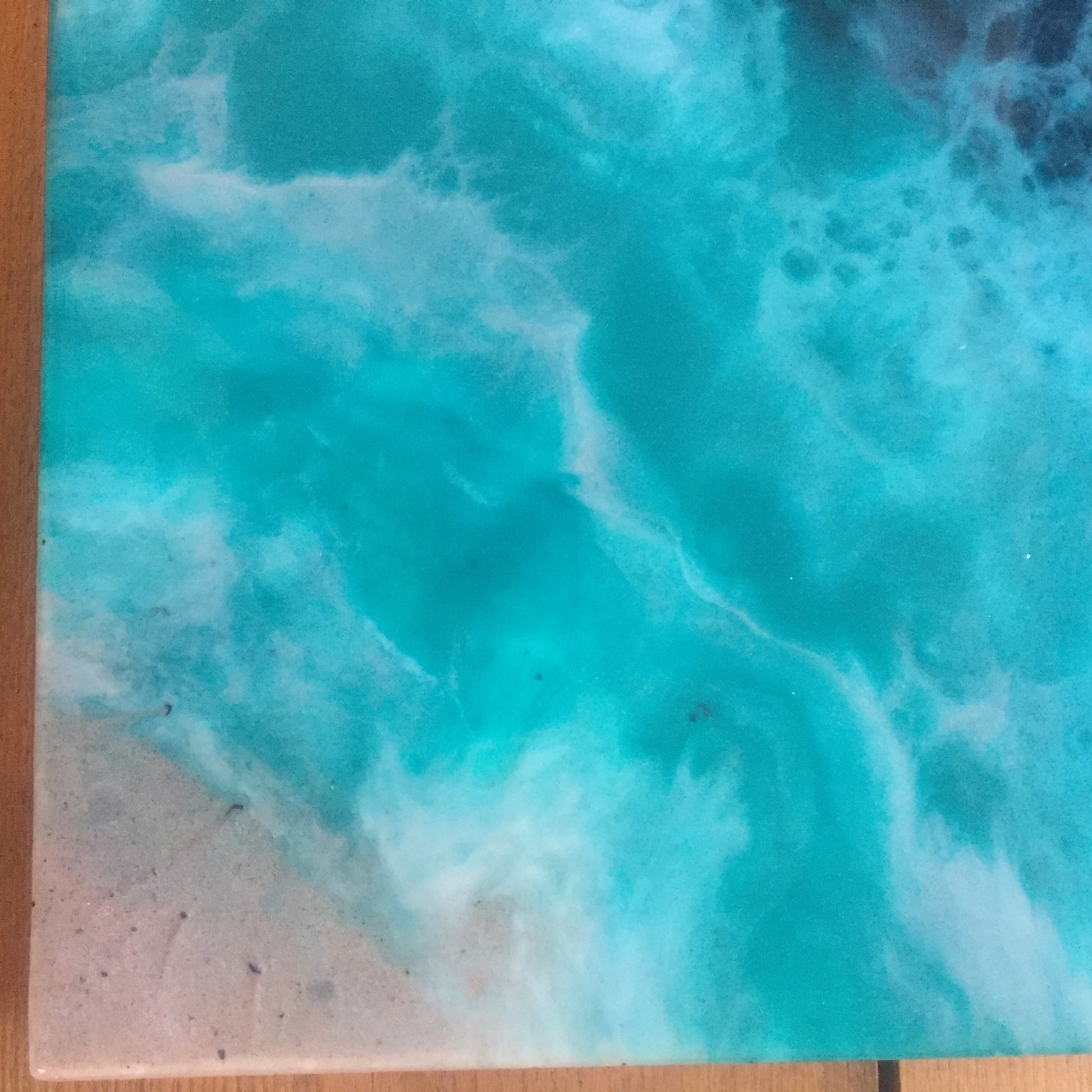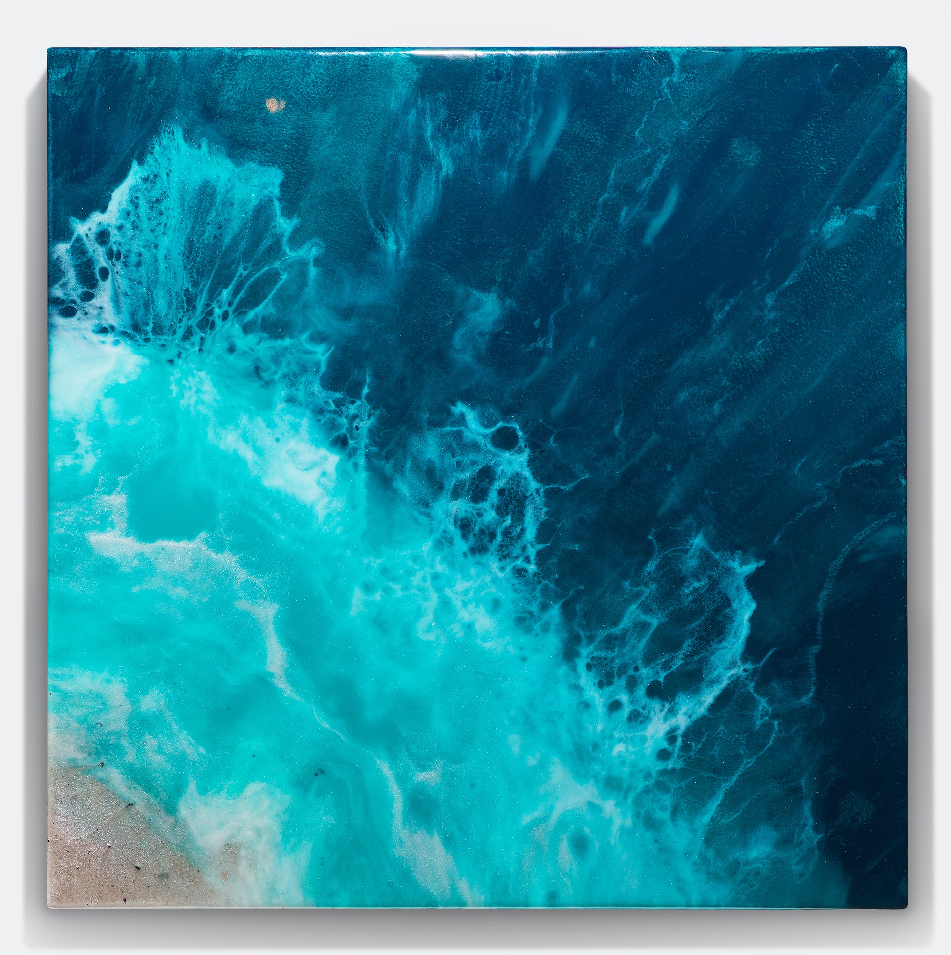 Inspired by a gorgeous photo I saw, this is A View From Above. The ocean brings us many emotions and this artwork is inspired by the feeling of depth and intrigue. Deep greeny blues and sparkly sand make this a stand out small piece.