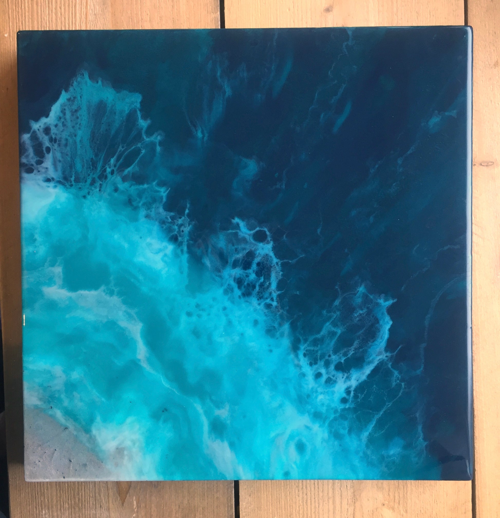 - 30cm x 30cm x 2.5cm. Resin mixed with a variety of paints and pigments on a custom made wooden art board.