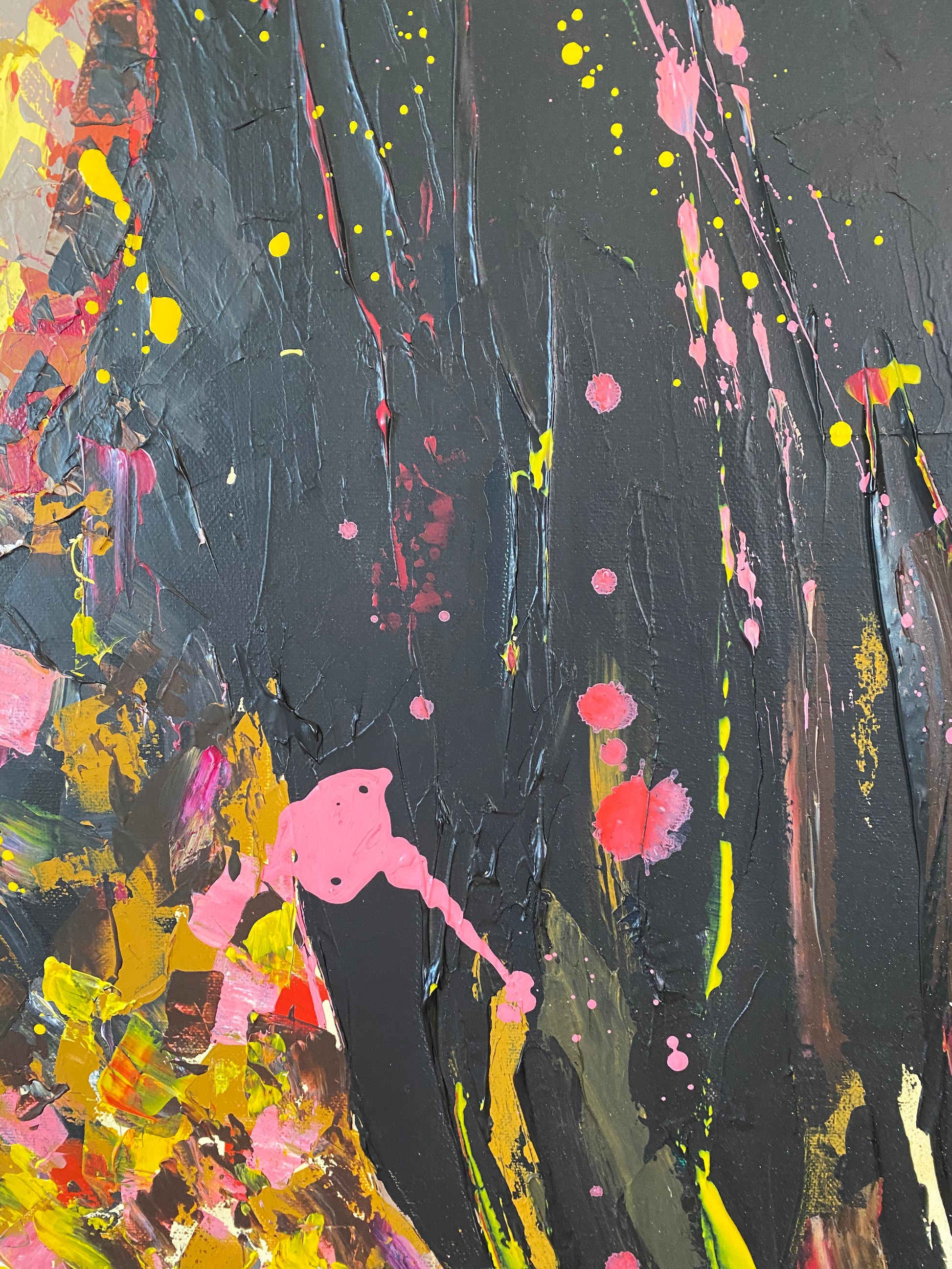 This is a highly textured artwork with energetic brushstrokes, loose splashes of paint and vibrant colours on a yellow background.