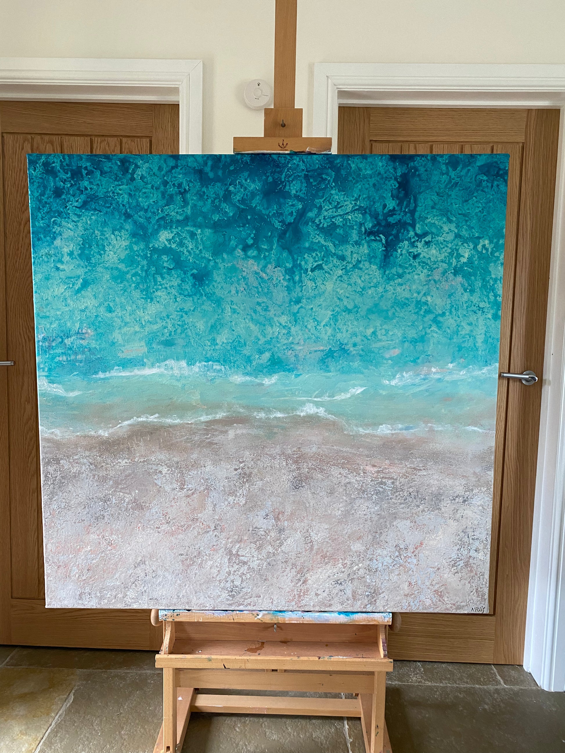 The ocean effect was created using a technique I have been developing over the past year which involves various different paints and inks. The sand effect is highly textured with many layers of paint giving great detail.